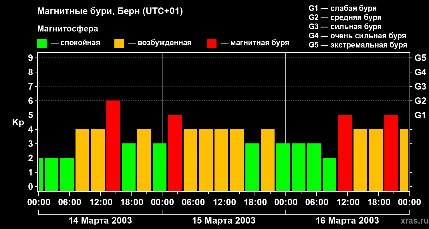 Изменения геомагнитного индекса Kp с 14 по 16 марта 2003 года для средних широт