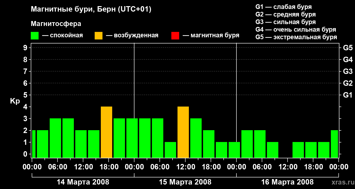 Изменения геомагнитного индекса Kp с 14 по 16 марта 2008 года для средних широт