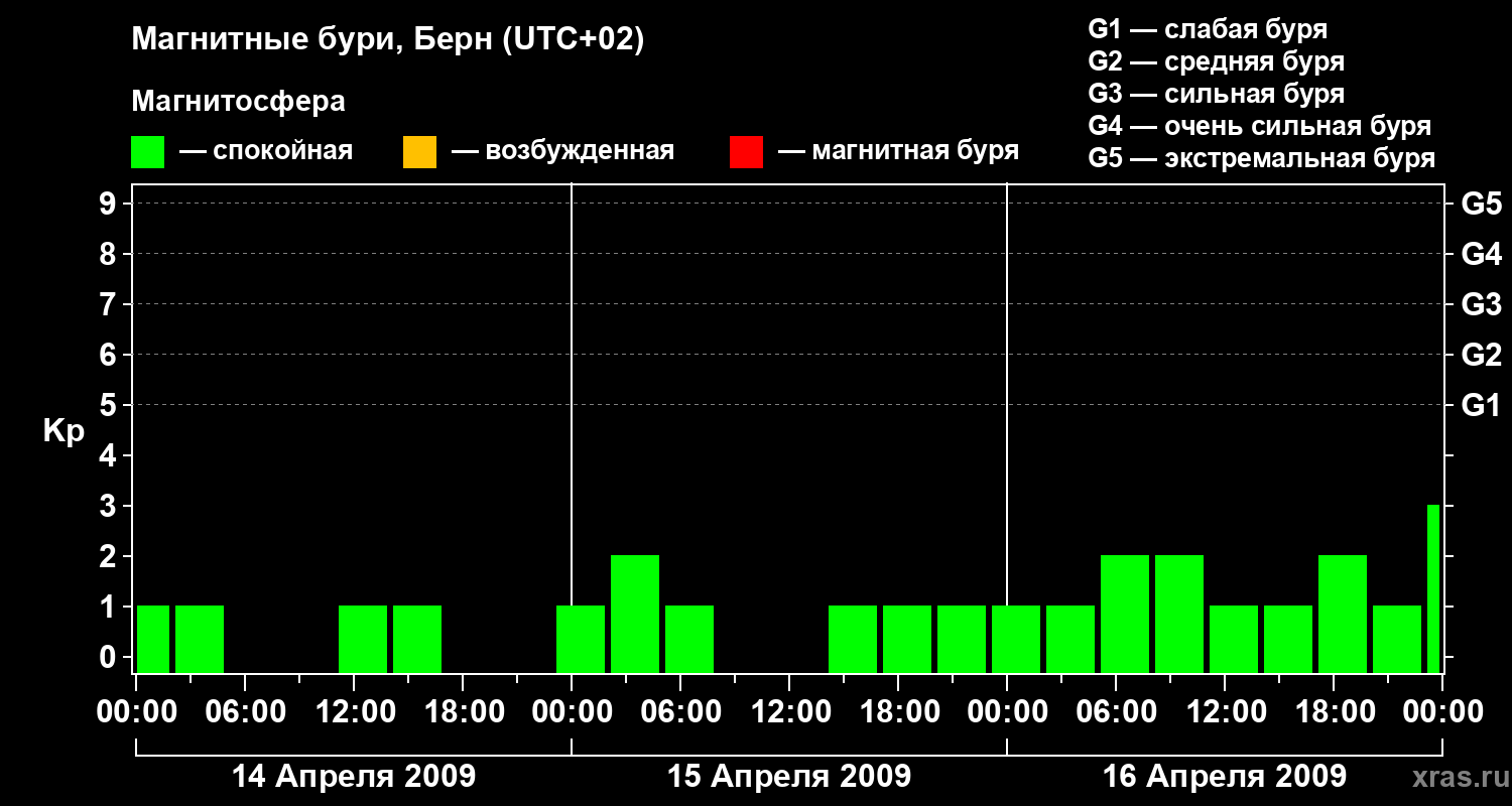Изменения геомагнитного индекса Kp с 14 по 16 апреля 2009 года для средних широт