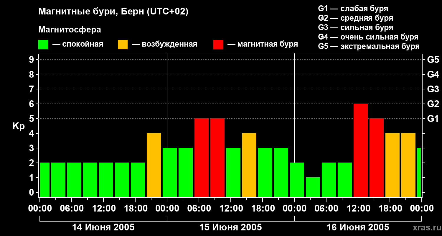 Изменения геомагнитного индекса Kp с 14 по 16 июня 2005 года для средних широт