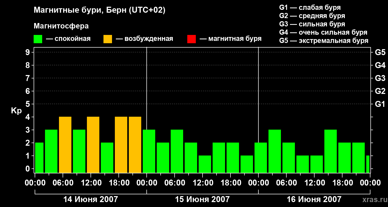 Изменения геомагнитного индекса Kp с 14 по 16 июня 2007 года для средних широт