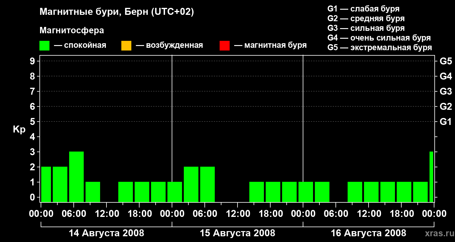 Изменения геомагнитного индекса Kp с 14 по 16 августа 2008 года для средних широт