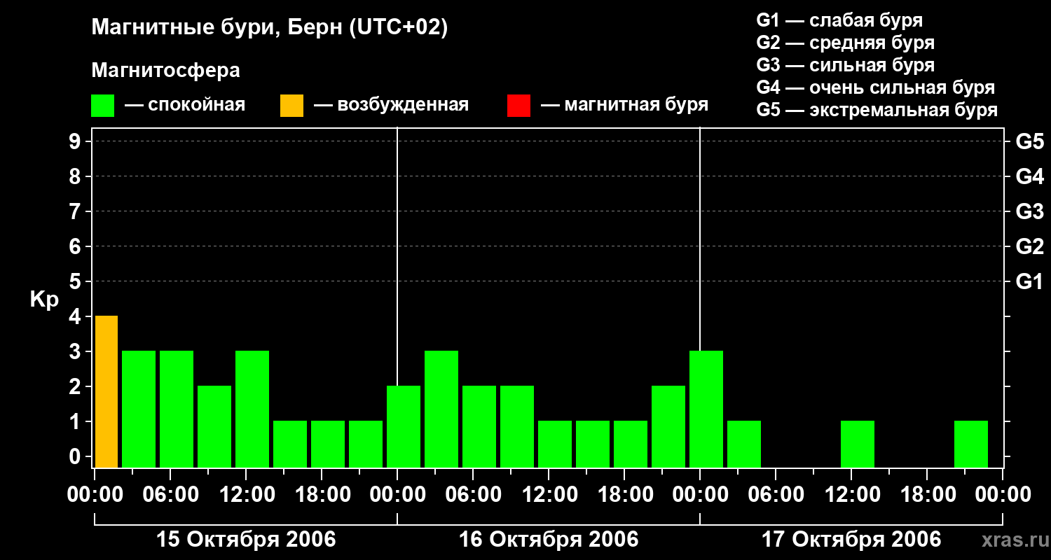 Изменения геомагнитного индекса Kp с 15 по 17 октября 2006 года для средних широт