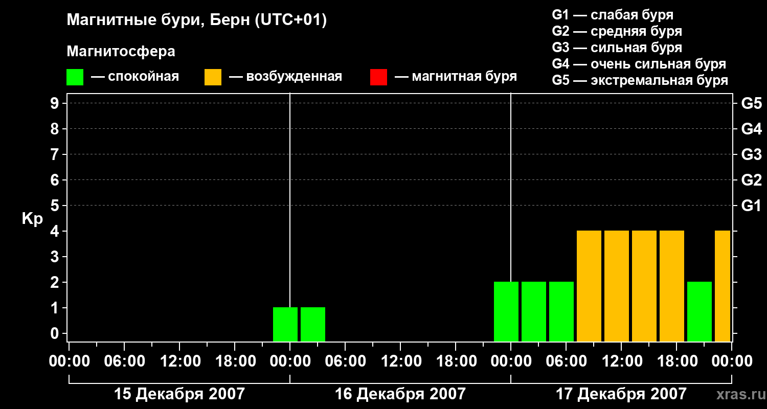 Изменения геомагнитного индекса Kp с 15 по 17 декабря 2007 года для средних широт