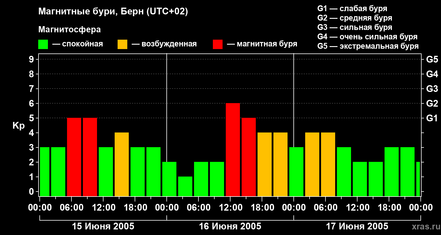 Изменения геомагнитного индекса Kp с 15 по 17 июня 2005 года для средних широт