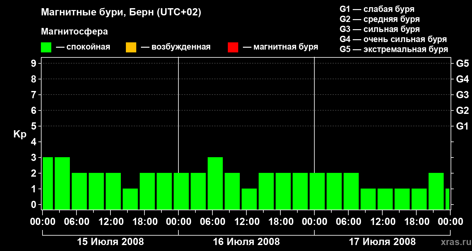 Изменения геомагнитного индекса Kp с 15 по 17 июля 2008 года для средних широт