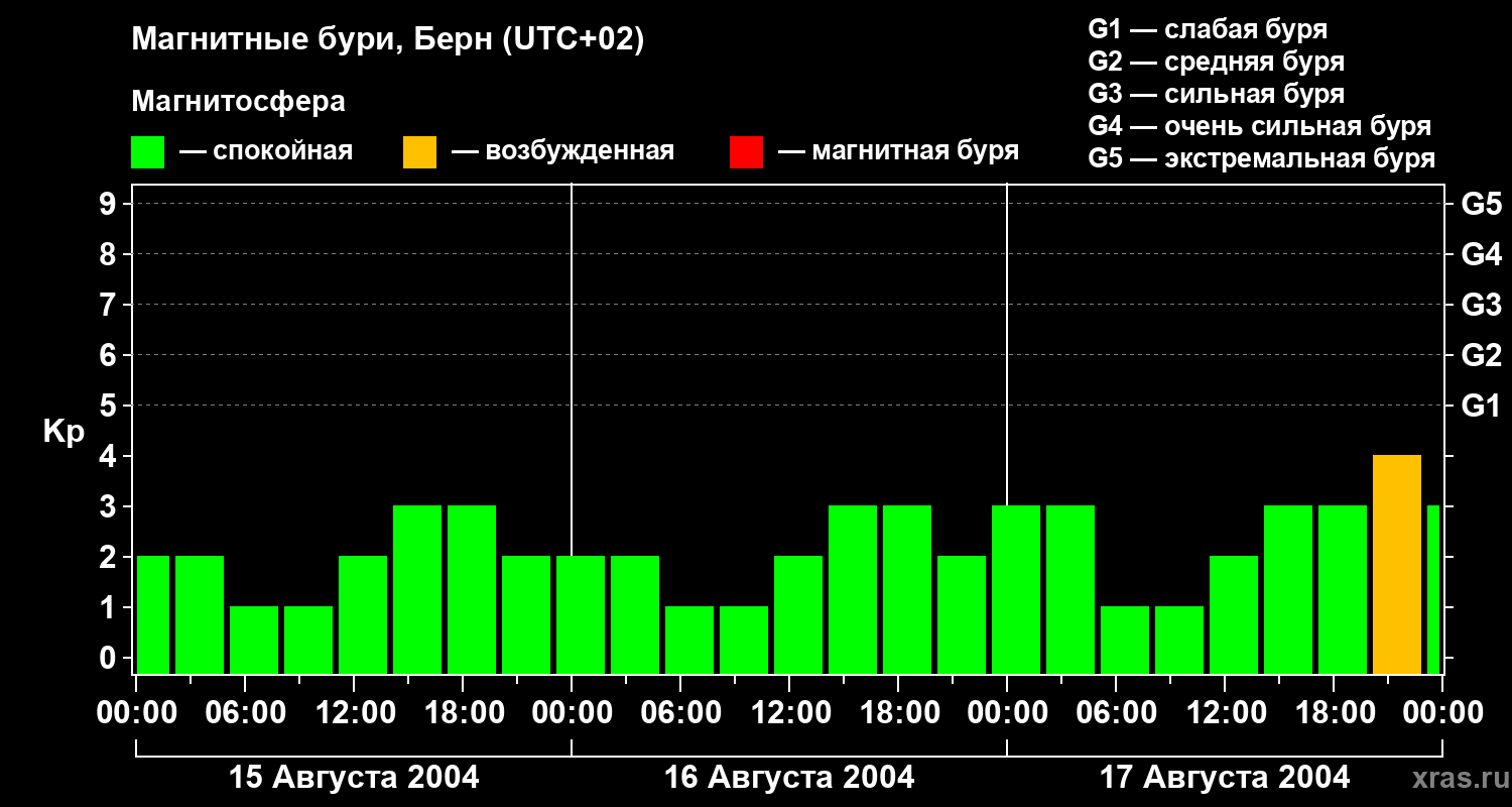 Изменения геомагнитного индекса Kp с 15 по 17 августа 2004 года для средних широт