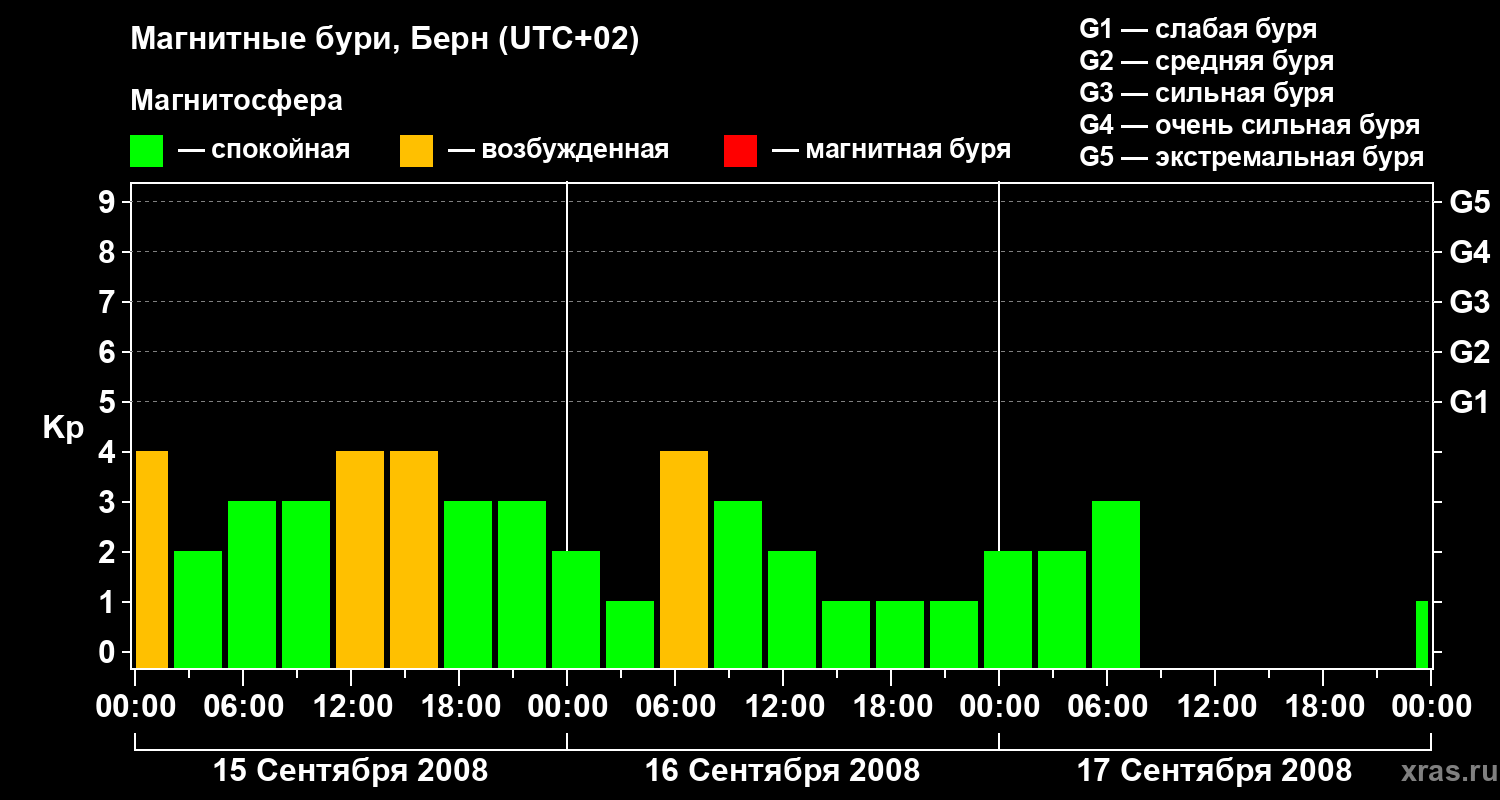 Изменения геомагнитного индекса Kp с 15 по 17 сентября 2008 года для средних широт