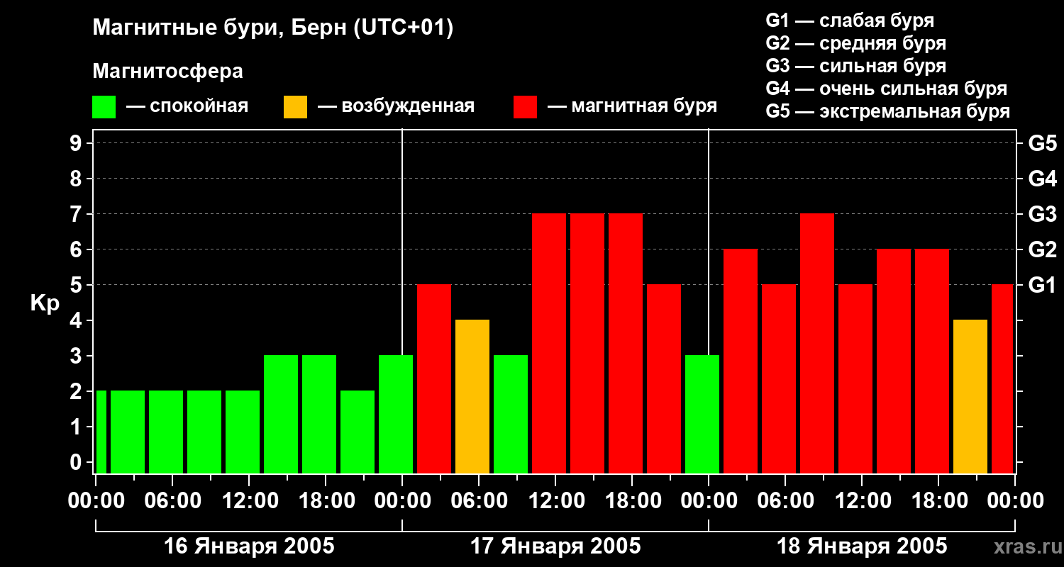 Изменения геомагнитного индекса Kp с 16 по 18 января 2005 года для средних широт