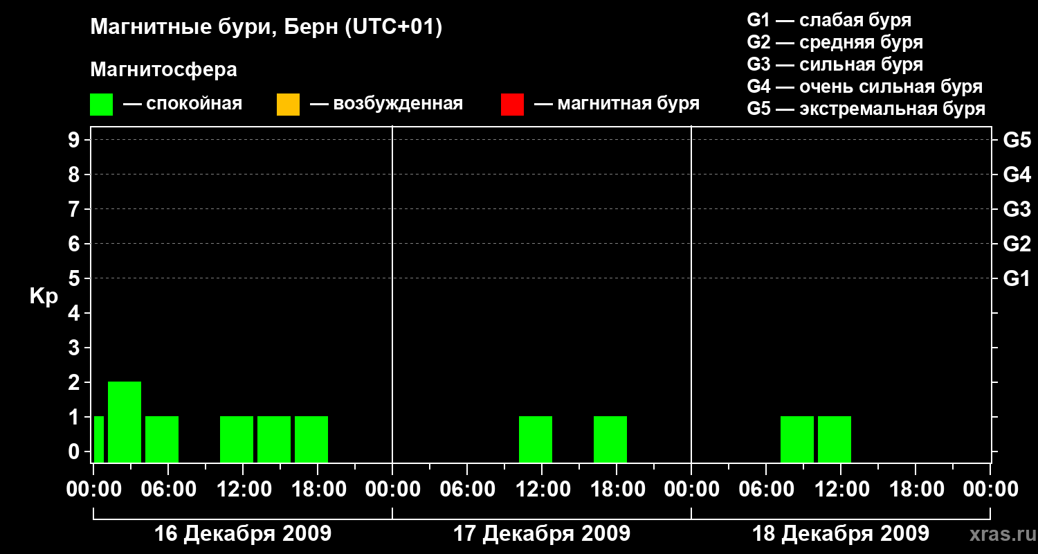 Изменения геомагнитного индекса Kp с 16 по 18 декабря 2009 года для средних широт