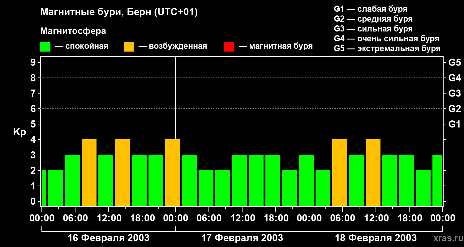 Изменения геомагнитного индекса Kp с 16 по 18 февраля 2003 года для средних широт