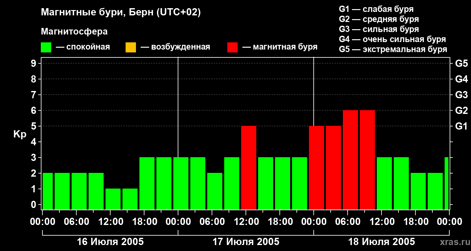 Изменения геомагнитного индекса Kp с 16 по 18 июля 2005 года для средних широт