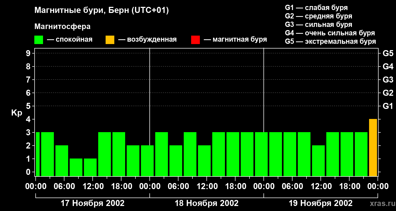 Изменения геомагнитного индекса Kp с 17 по 19 ноября 2002 года для средних широт