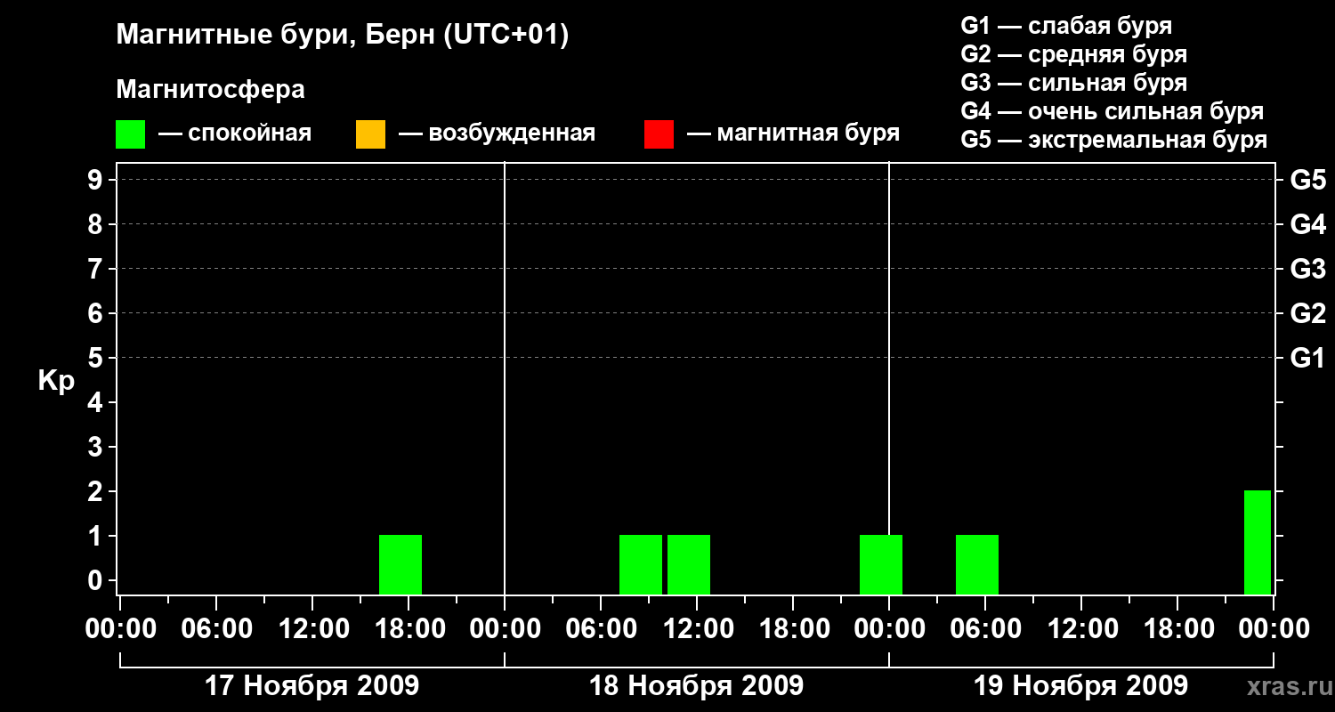 Изменения геомагнитного индекса Kp с 17 по 19 ноября 2009 года для средних широт