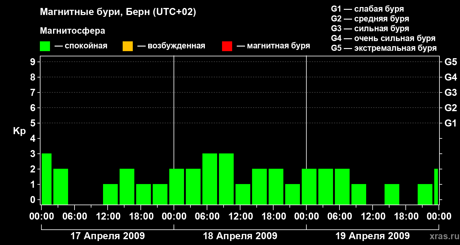Изменения геомагнитного индекса Kp с 17 по 19 апреля 2009 года для средних широт