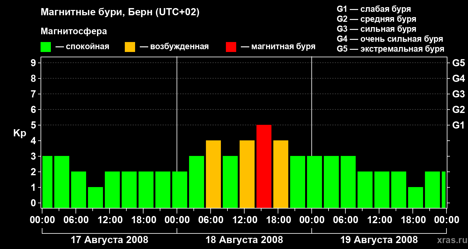 Изменения геомагнитного индекса Kp с 17 по 19 августа 2008 года для средних широт