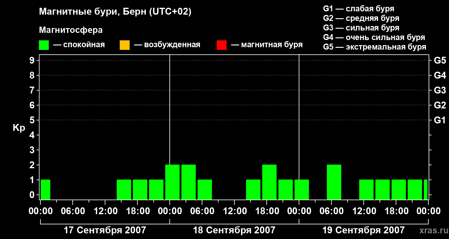 Изменения геомагнитного индекса Kp с 17 по 19 сентября 2007 года для средних широт
