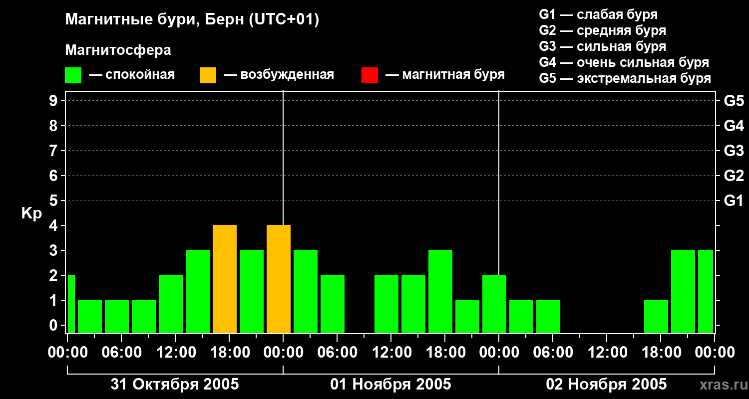 Изменения геомагнитного индекса Kp с 31 октября по 2 ноября 2005 года для средних широт