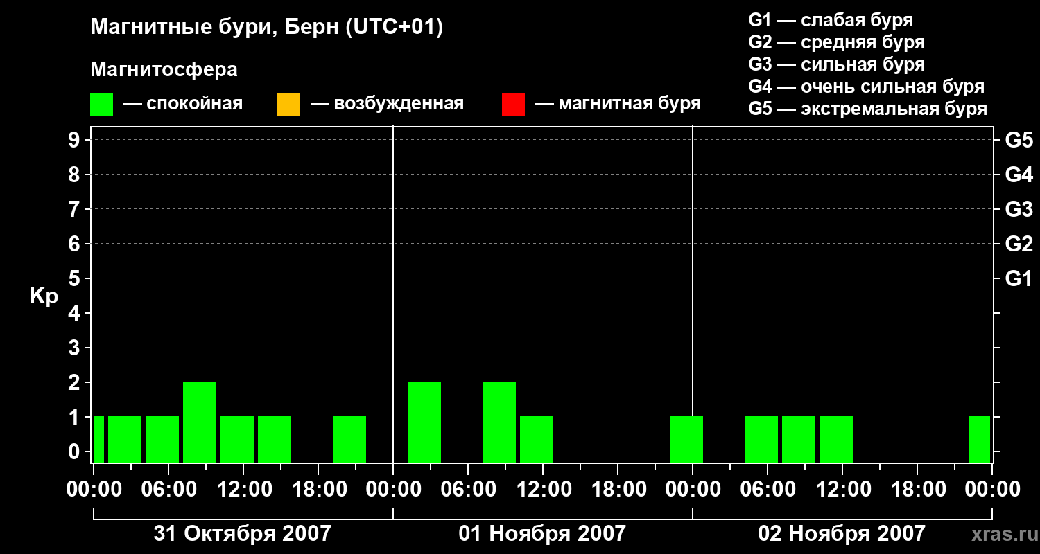 Изменения геомагнитного индекса Kp с 31 октября по 2 ноября 2007 года для средних широт