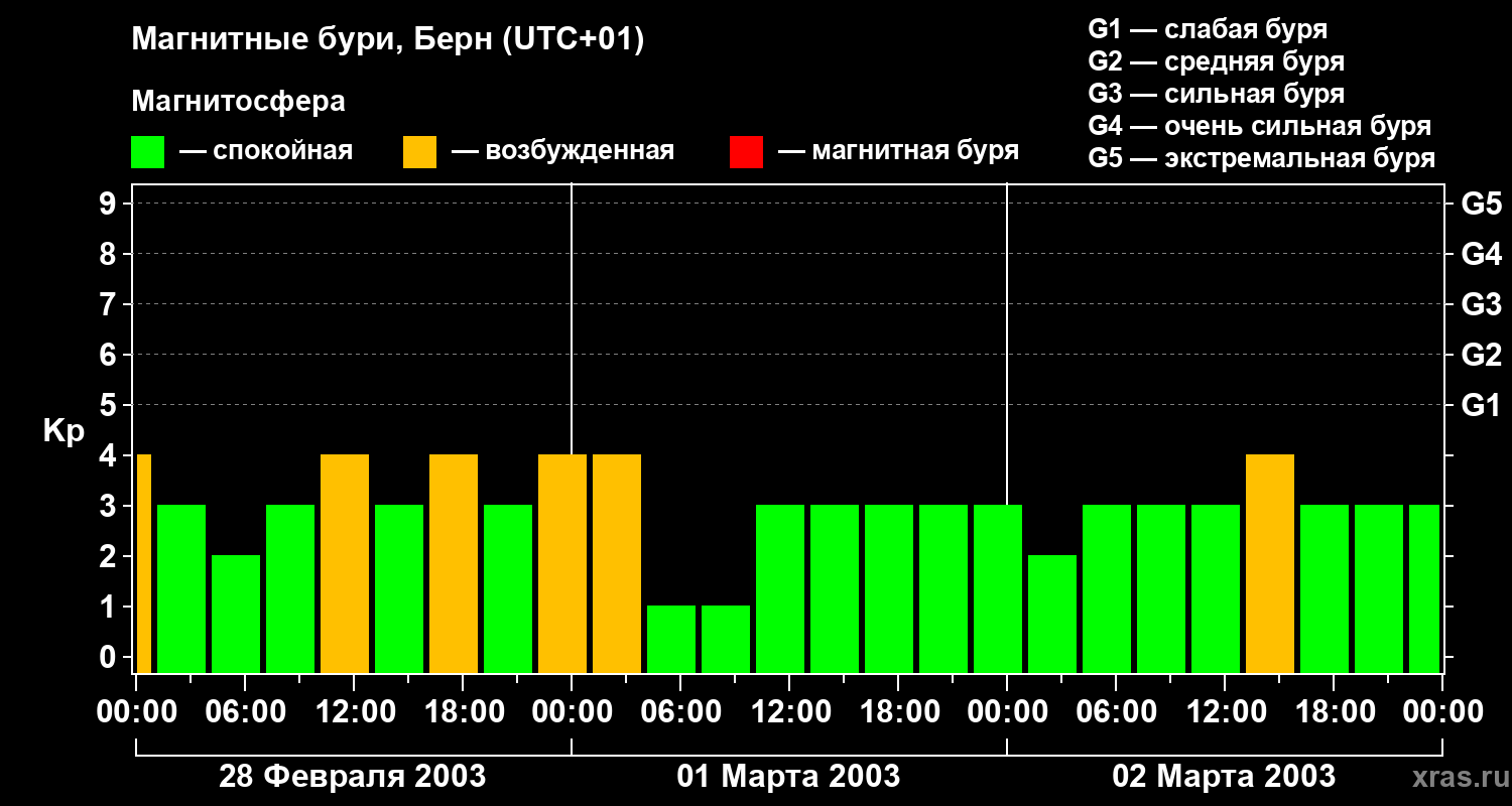 Изменения геомагнитного индекса Kp с 28 февраля по 2 марта 2003 года для средних широт