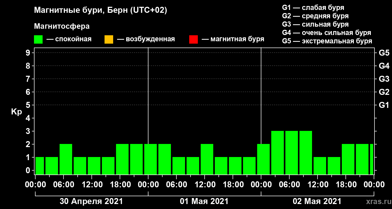 Изменения геомагнитного индекса Kp с 30 апреля по 2 мая 2021 года для средних широт