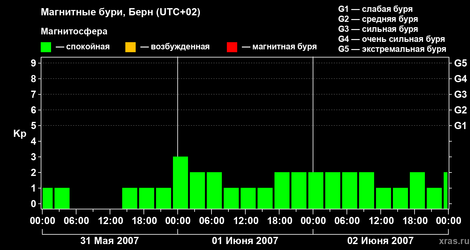 Изменения геомагнитного индекса Kp с 31 мая по 2 июня 2007 года для средних широт