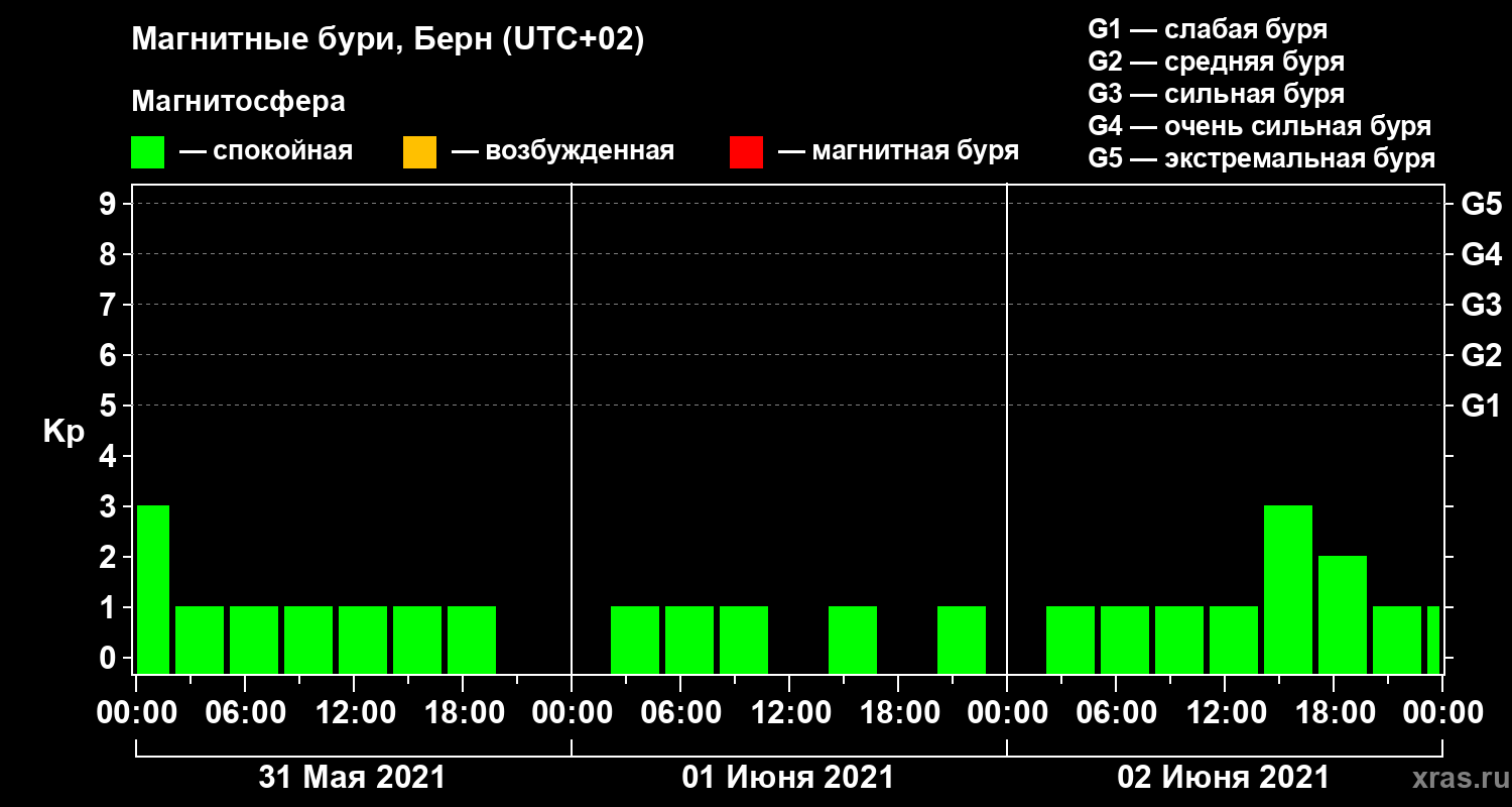 Изменения геомагнитного индекса Kp с 31 мая по 2 июня 2021 года для средних широт