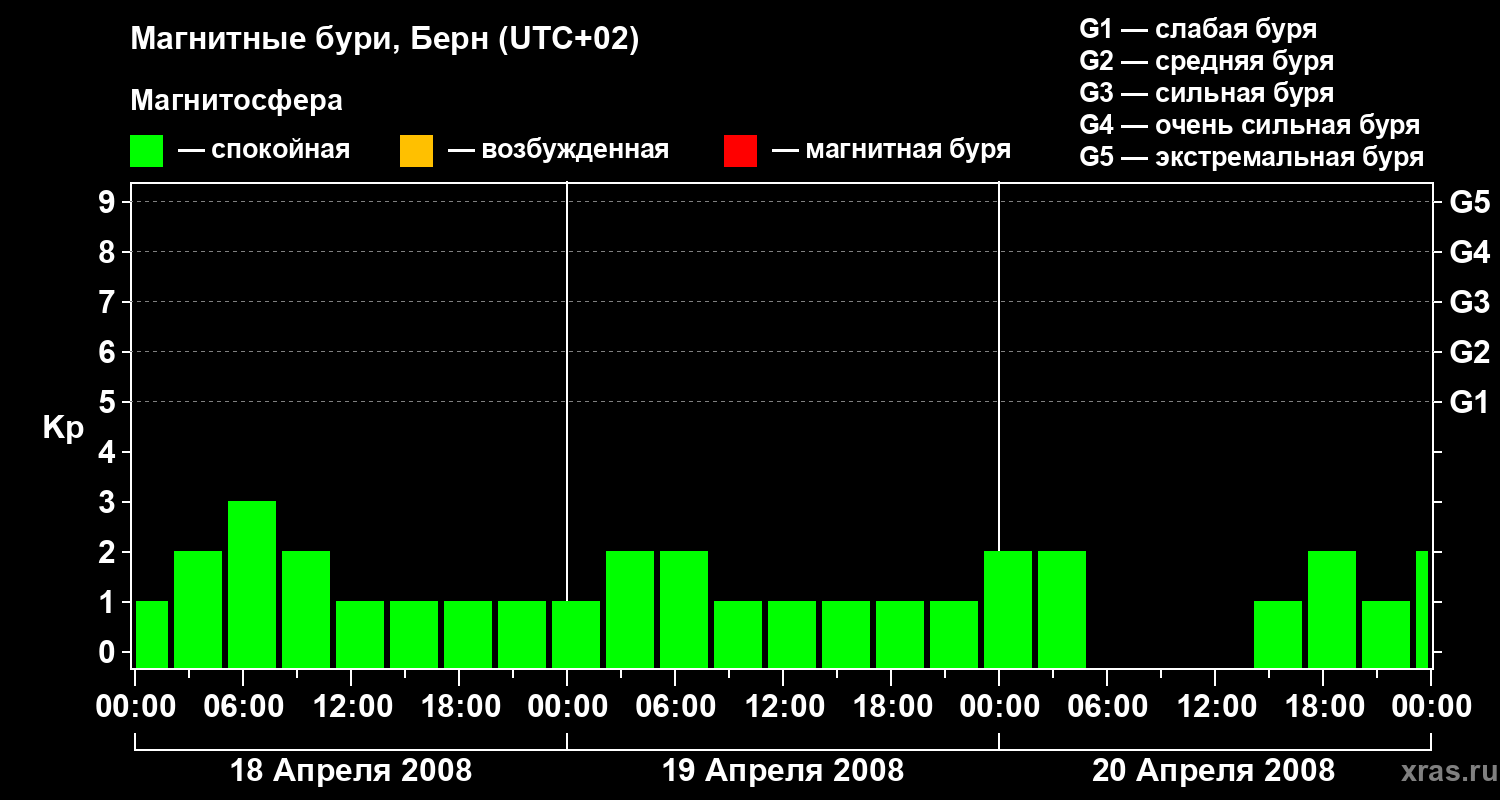 Изменения геомагнитного индекса Kp с 18 по 20 апреля 2008 года для средних широт