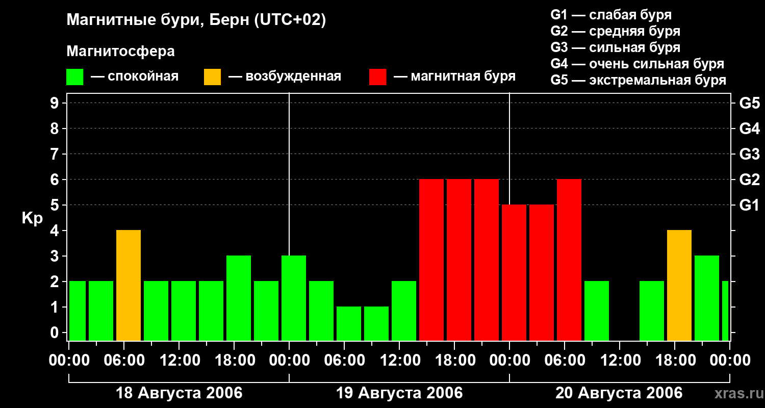 Изменения геомагнитного индекса Kp с 18 по 20 августа 2006 года для средних широт