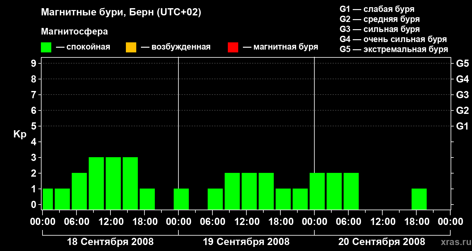 Изменения геомагнитного индекса Kp с 18 по 20 сентября 2008 года для средних широт