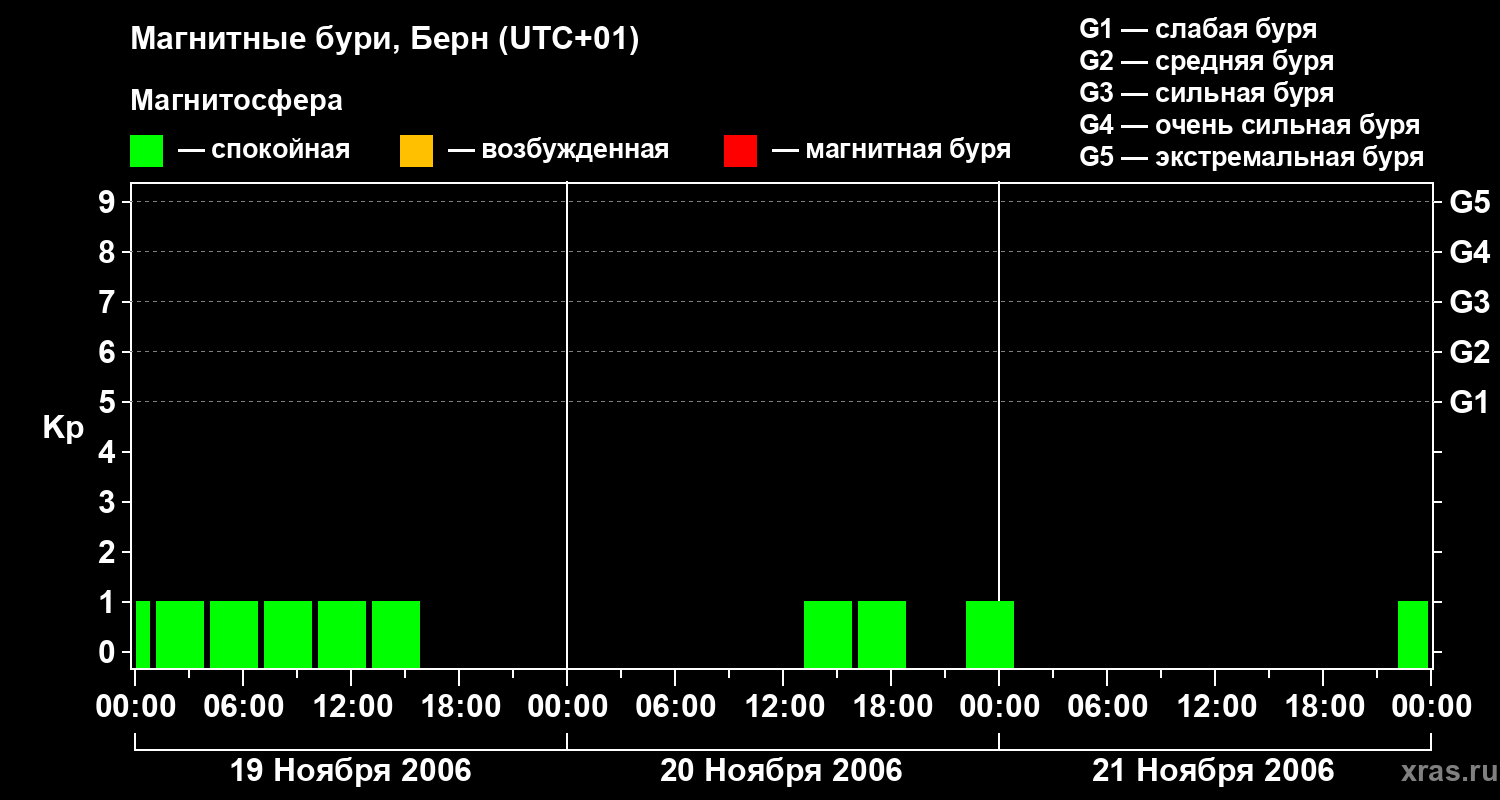 Изменения геомагнитного индекса Kp с 19 по 21 ноября 2006 года для средних широт