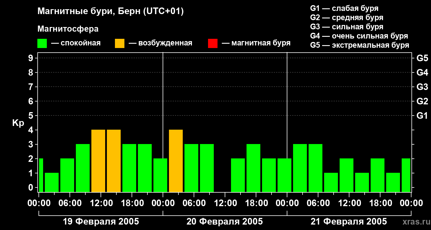 Изменения геомагнитного индекса Kp с 19 по 21 февраля 2005 года для средних широт