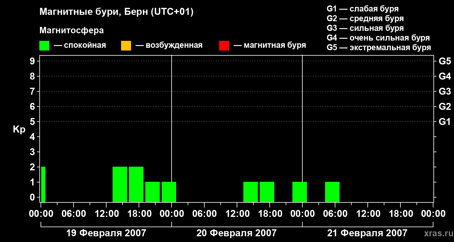 Изменения геомагнитного индекса Kp с 19 по 21 февраля 2007 года для средних широт