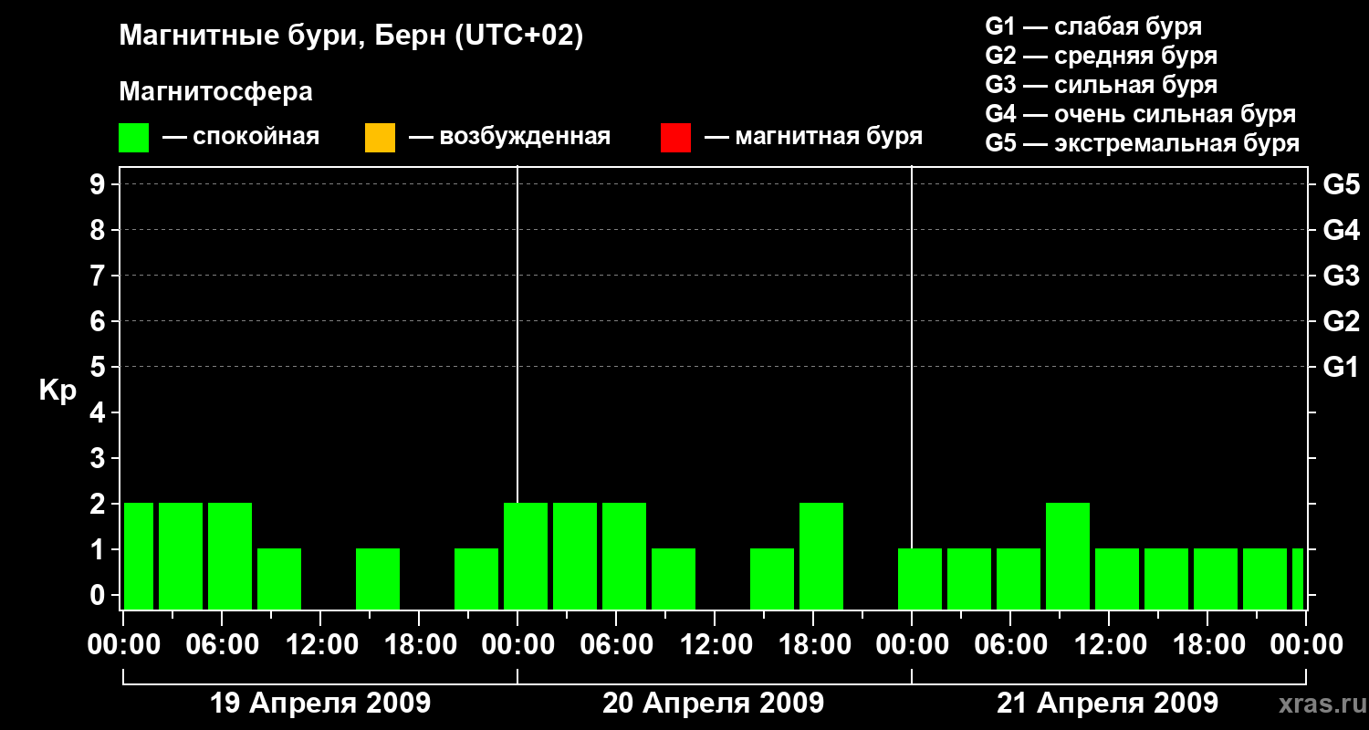 Изменения геомагнитного индекса Kp с 19 по 21 апреля 2009 года для средних широт