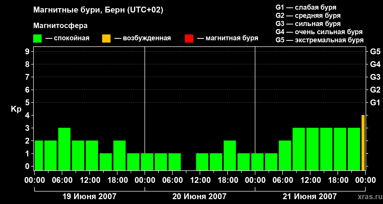 Изменения геомагнитного индекса Kp с 19 по 21 июня 2007 года для средних широт
