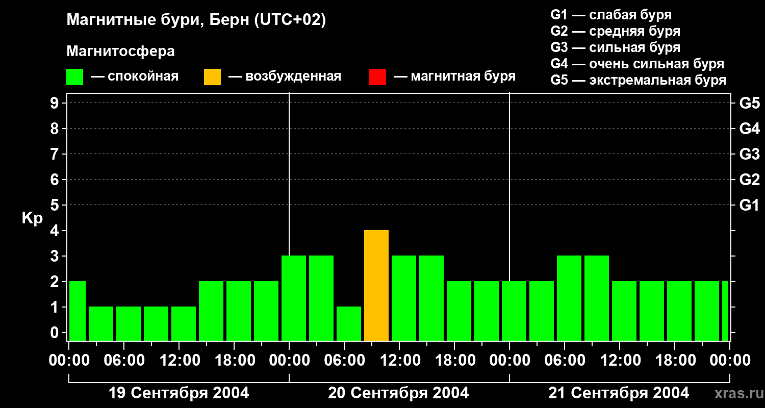 Изменения геомагнитного индекса Kp с 19 по 21 сентября 2004 года для средних широт