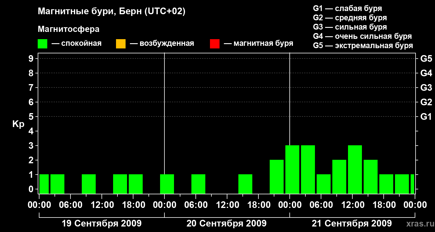 Изменения геомагнитного индекса Kp с 19 по 21 сентября 2009 года для средних широт