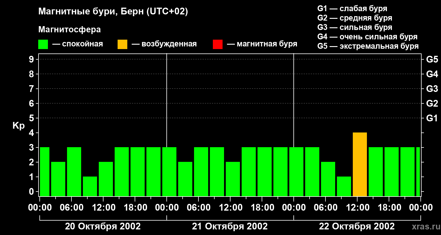 Изменения геомагнитного индекса Kp с 20 по 22 октября 2002 года для средних широт