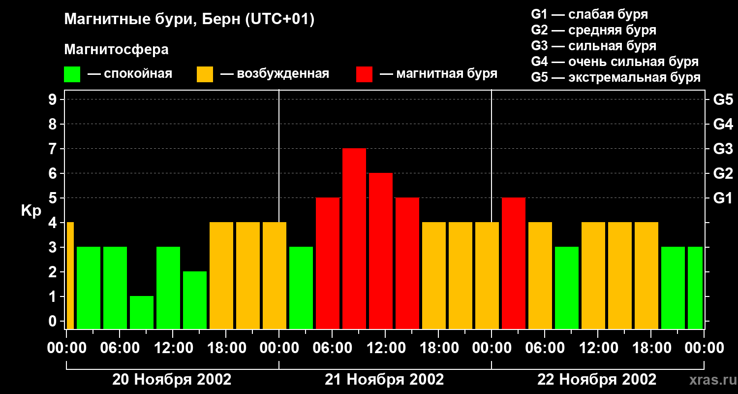 Изменения геомагнитного индекса Kp с 20 по 22 ноября 2002 года для средних широт