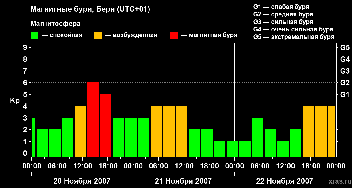 Изменения геомагнитного индекса Kp с 20 по 22 ноября 2007 года для средних широт