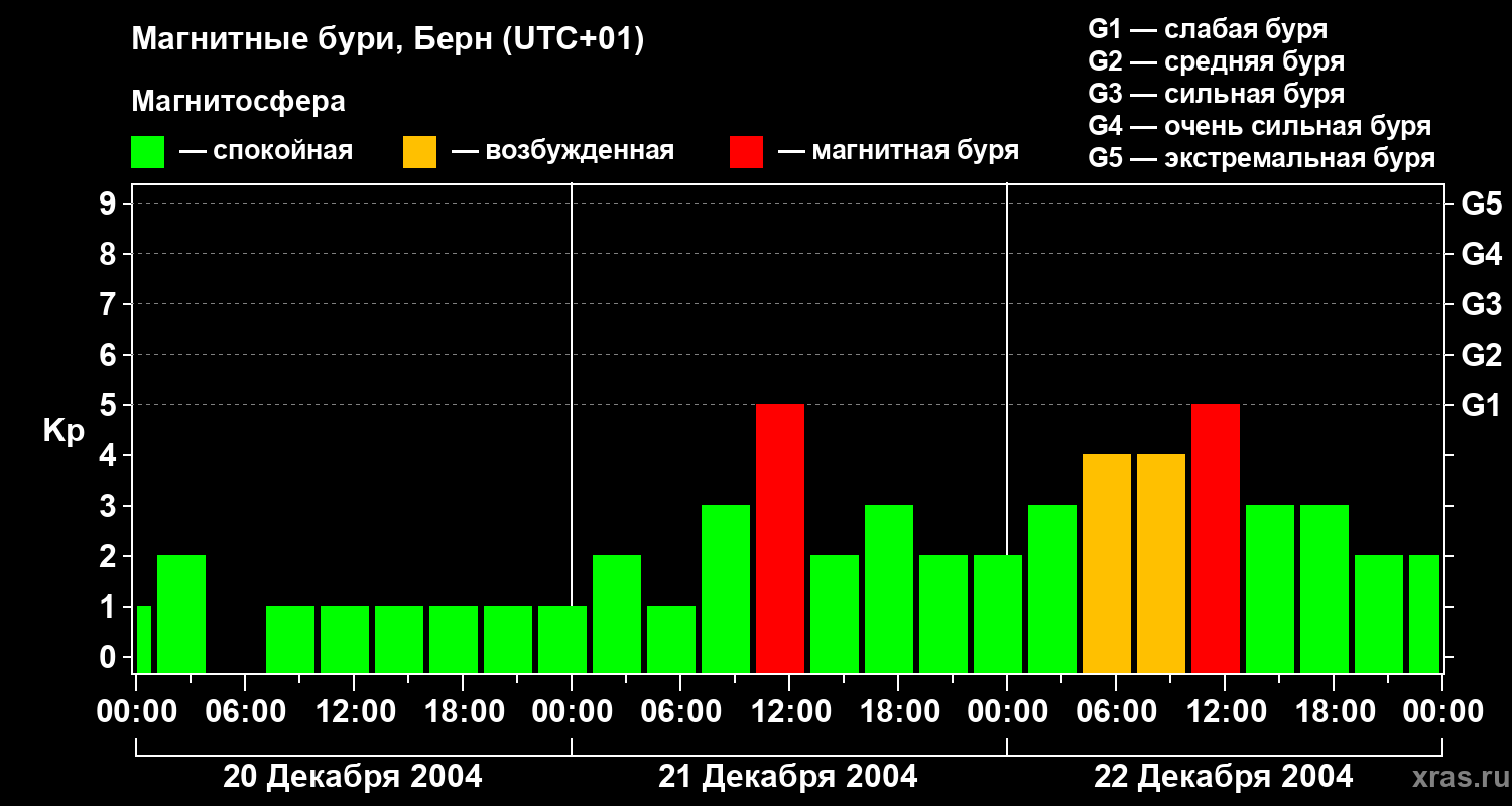 Изменения геомагнитного индекса Kp с 20 по 22 декабря 2004 года для средних широт