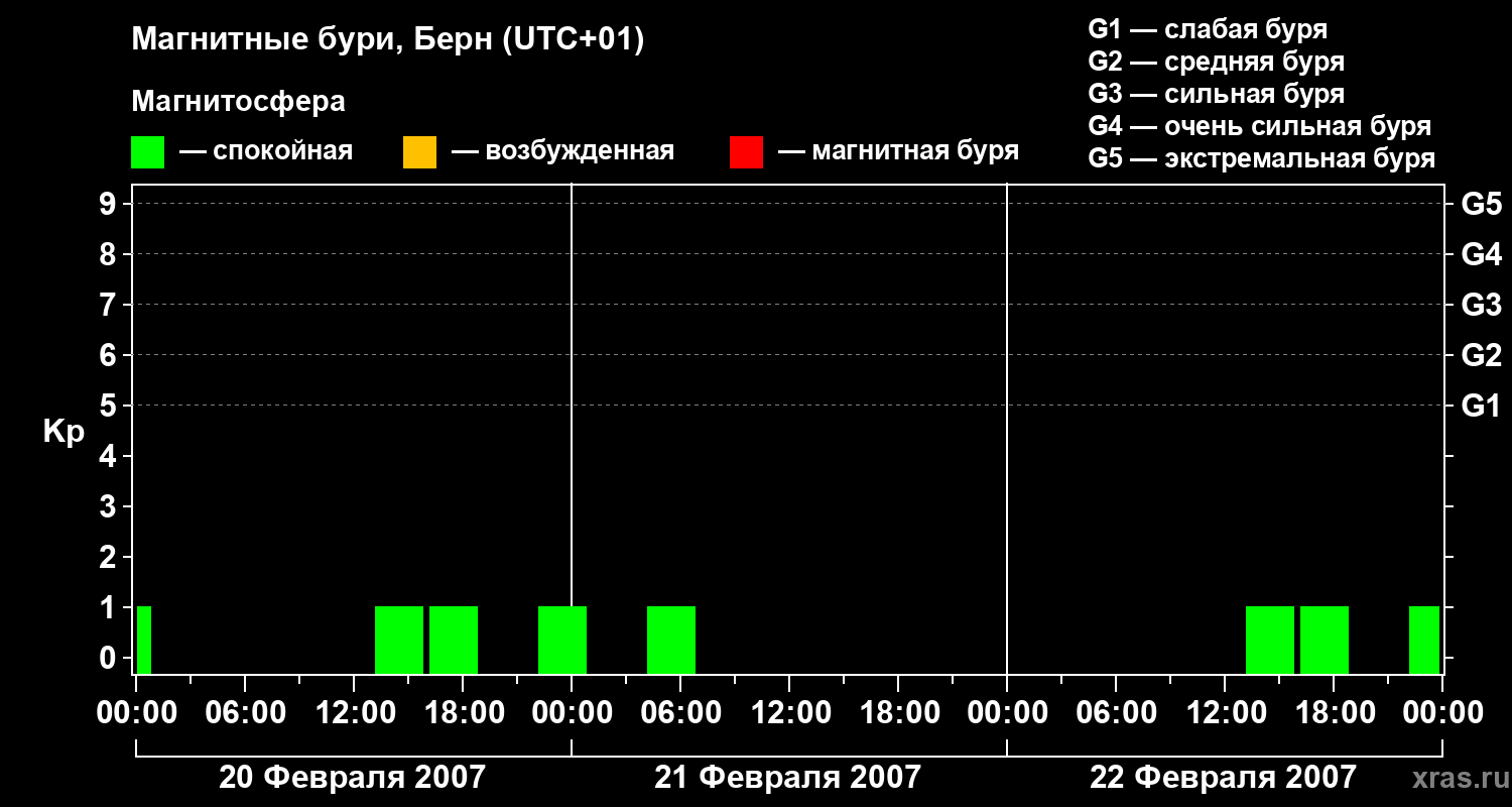 Изменения геомагнитного индекса Kp с 20 по 22 февраля 2007 года для средних широт