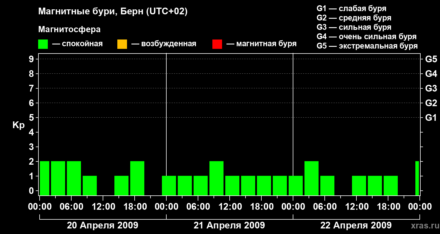 Изменения геомагнитного индекса Kp с 20 по 22 апреля 2009 года для средних широт