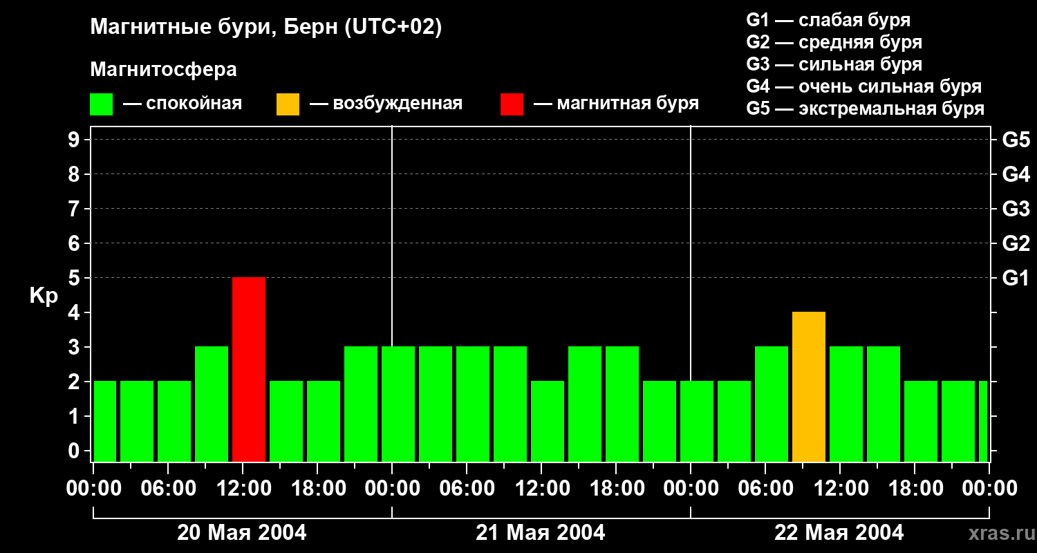 Изменения геомагнитного индекса Kp с 20 по 22 мая 2004 года для средних широт