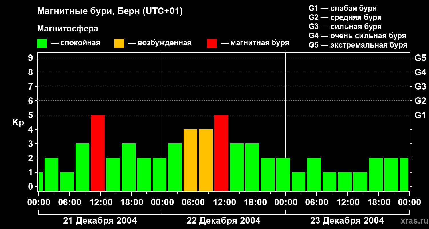 Изменения геомагнитного индекса Kp с 21 по 23 декабря 2004 года для средних широт
