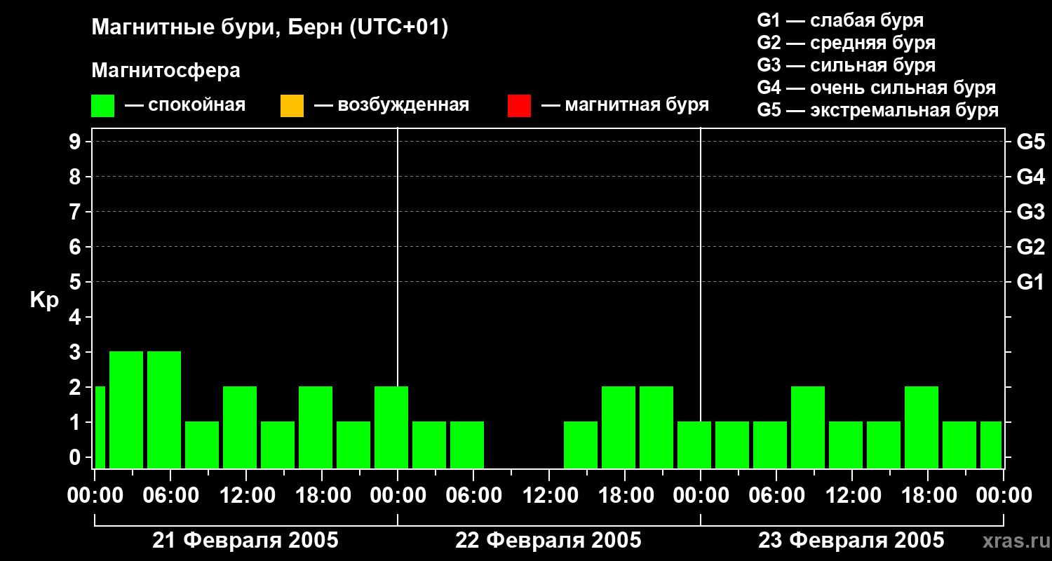 Изменения геомагнитного индекса Kp с 21 по 23 февраля 2005 года для средних широт