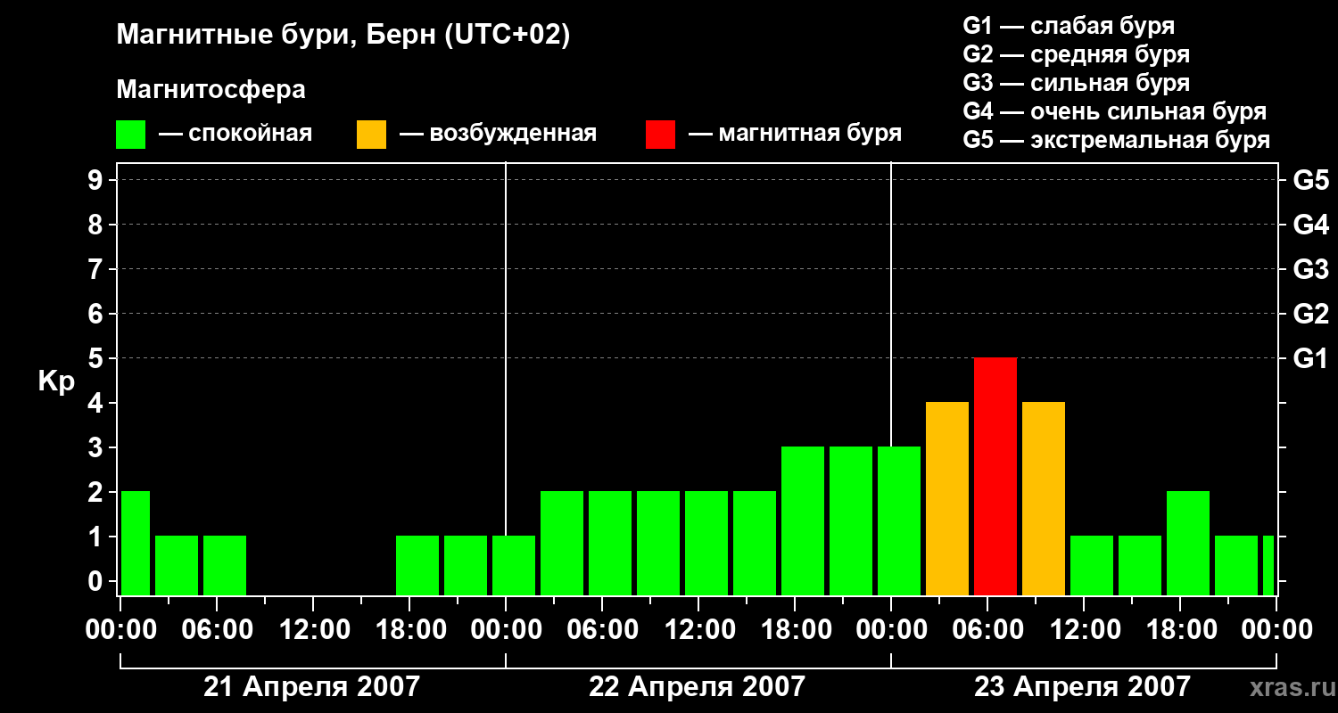 Изменения геомагнитного индекса Kp с 21 по 23 апреля 2007 года для средних широт