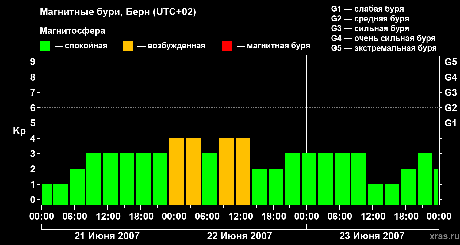 Изменения геомагнитного индекса Kp с 21 по 23 июня 2007 года для средних широт
