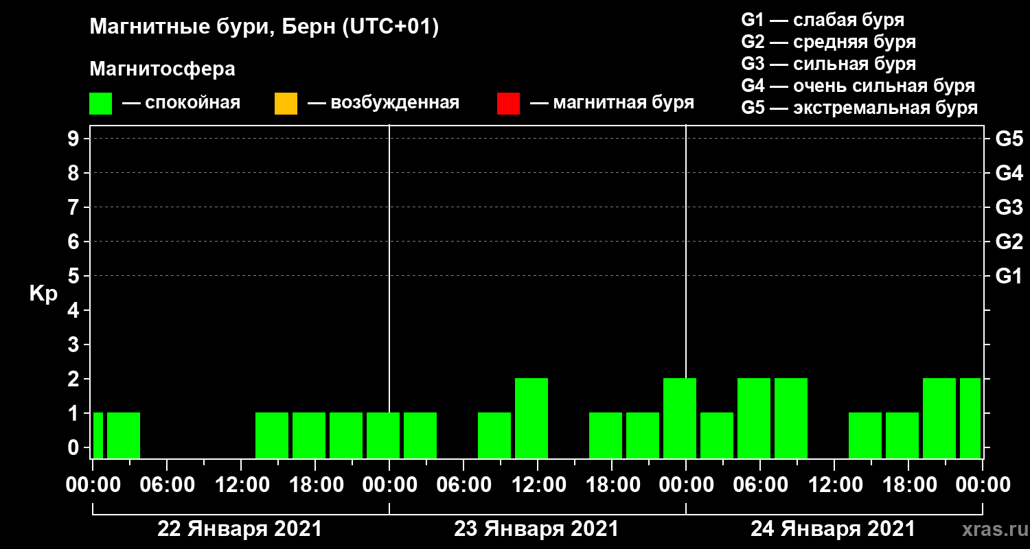 Изменения геомагнитного индекса Kp с 22 по 24 января 2021 года для средних широт