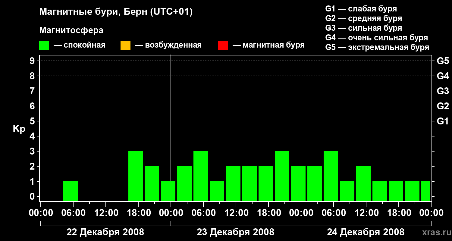 Изменения геомагнитного индекса Kp с 22 по 24 декабря 2008 года для средних широт